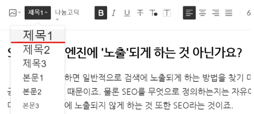 티스토리는 제목1로 설정해야 H2태그가 설정되고 H1태그는 제목에 자동설정 됩니다.