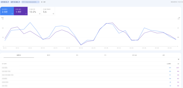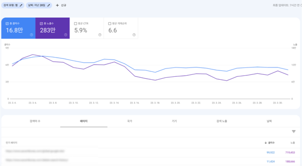 구글 서치 콘솔에서 검색결과 > 페이지 순으로 확인을 합니다.유입이 잘 이뤄지고 있는 페이지를 클릭한 후, 검색어를 확인해봅니다.
