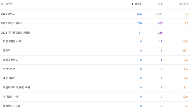 이번 예시로 든 페이지의 타겟 키워드는 마케팅 트랜드 였습니다. 여기서 2023 트랜드라는 키워드로는 월 675의 유입량을 가지고 있습니다. 그렇다면 이제는 이 페이지에서 파생된 유입 키워드를 확인해봅니다.