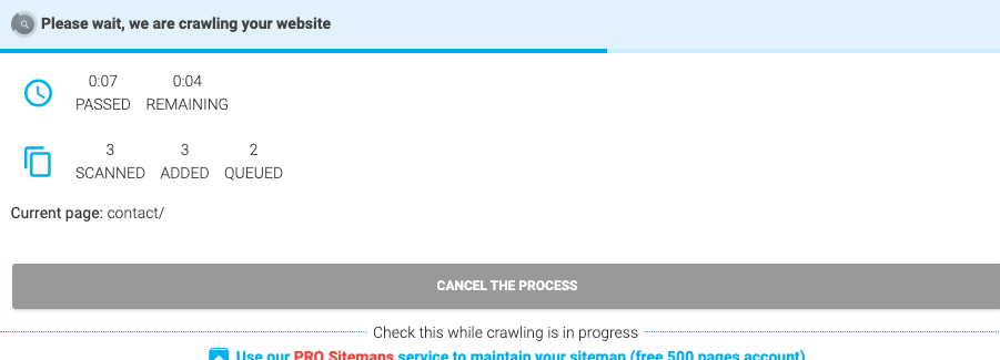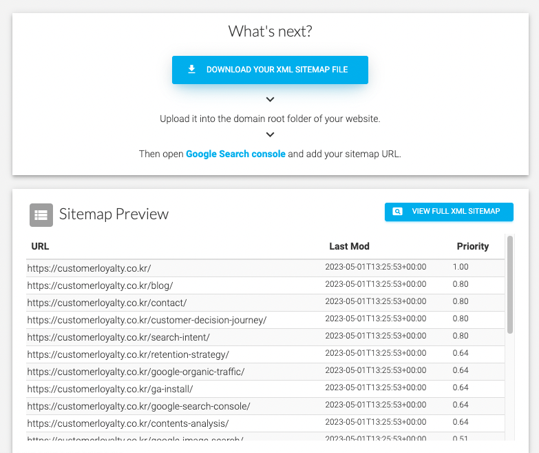 크롤링이 완료가되면 “DOWNLOAD YOUR XML SITEMAP FILE” 버튼을 클릭하면 sitemap.xml파일을 다운로드 받을 수 있습니다. 이 파일을 파일질라 같은 툴을 통해 루트 도메인에 업로드하면 됩니다.