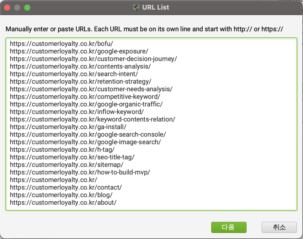 sitemap.xml에 업로드할 중심 URL을 업로드하고 다음을 누릅니다.
