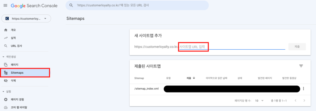 sitemaps > 새 사이트맵 추가에서 사이트맵 주소 입력 > 제출